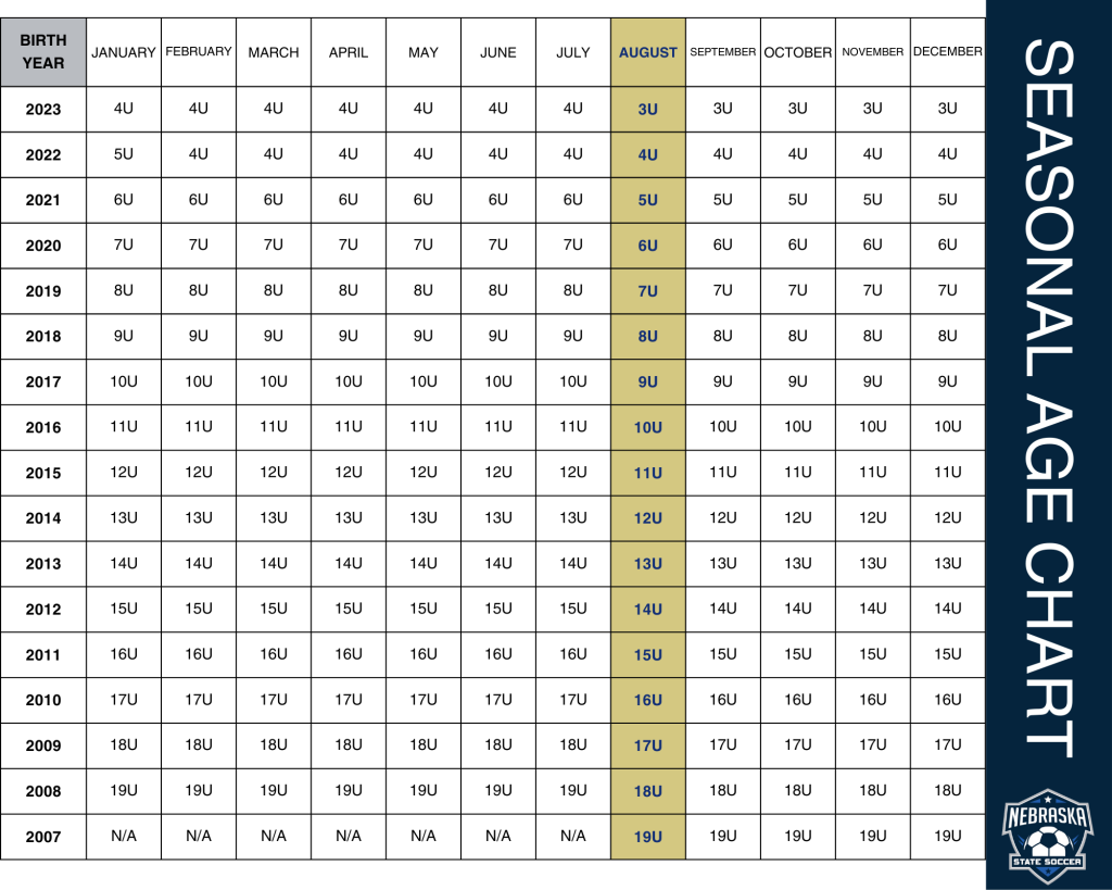 | 19U | Born between Jan 1, 2007 – Dec 31, 2007 | Born between Aug 1, 2007 – July 31, 2008 |
