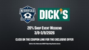 DICK’S Sporting Goods will be hosting a 20% off shop event for all Nebraska State Soccer athletes, coaches, and supporters at ALL Nebraska stores on 3/6-3/9/2026.