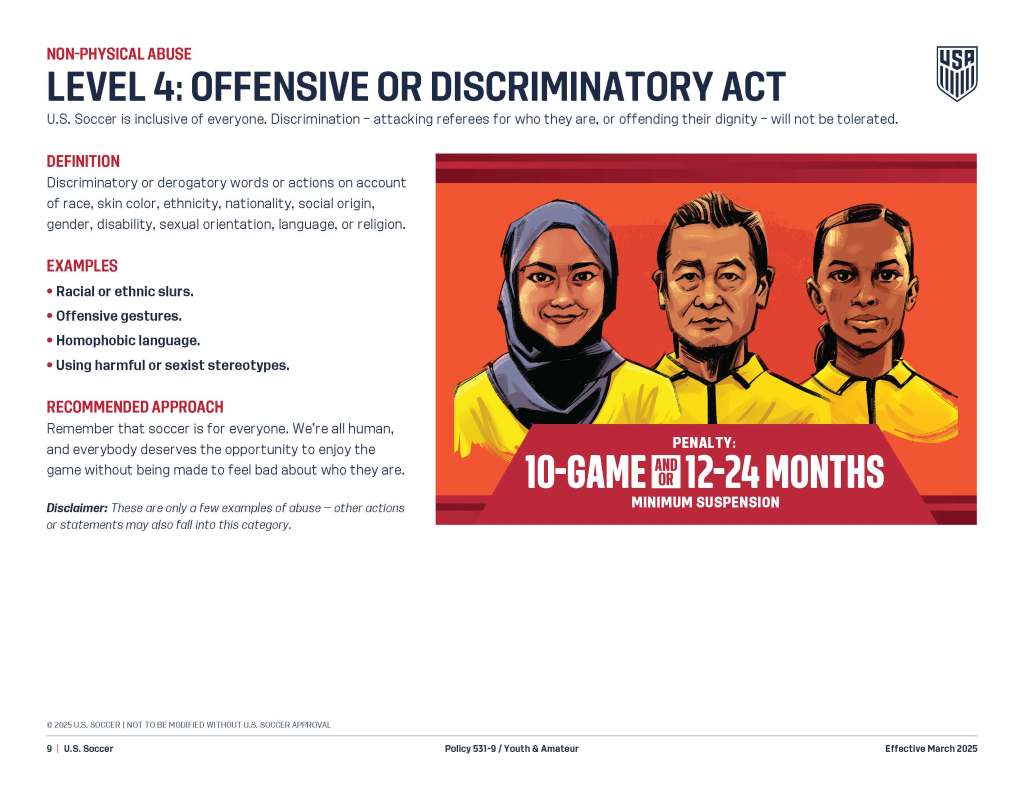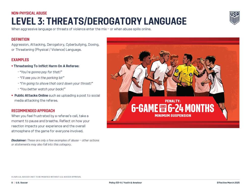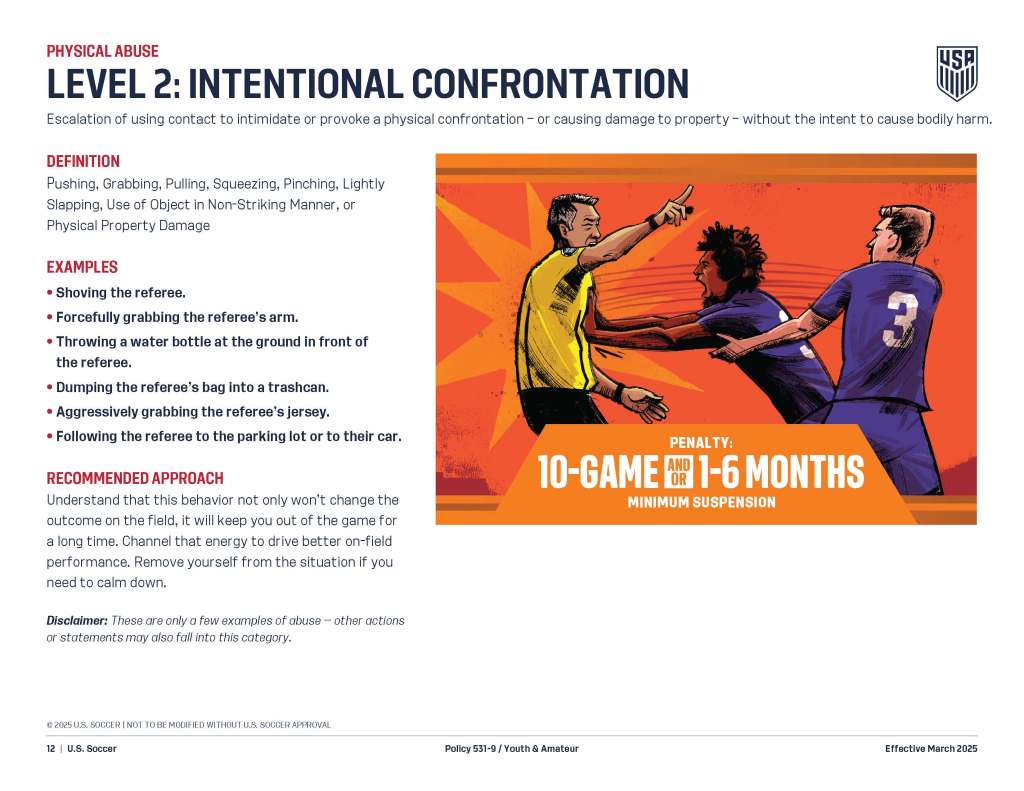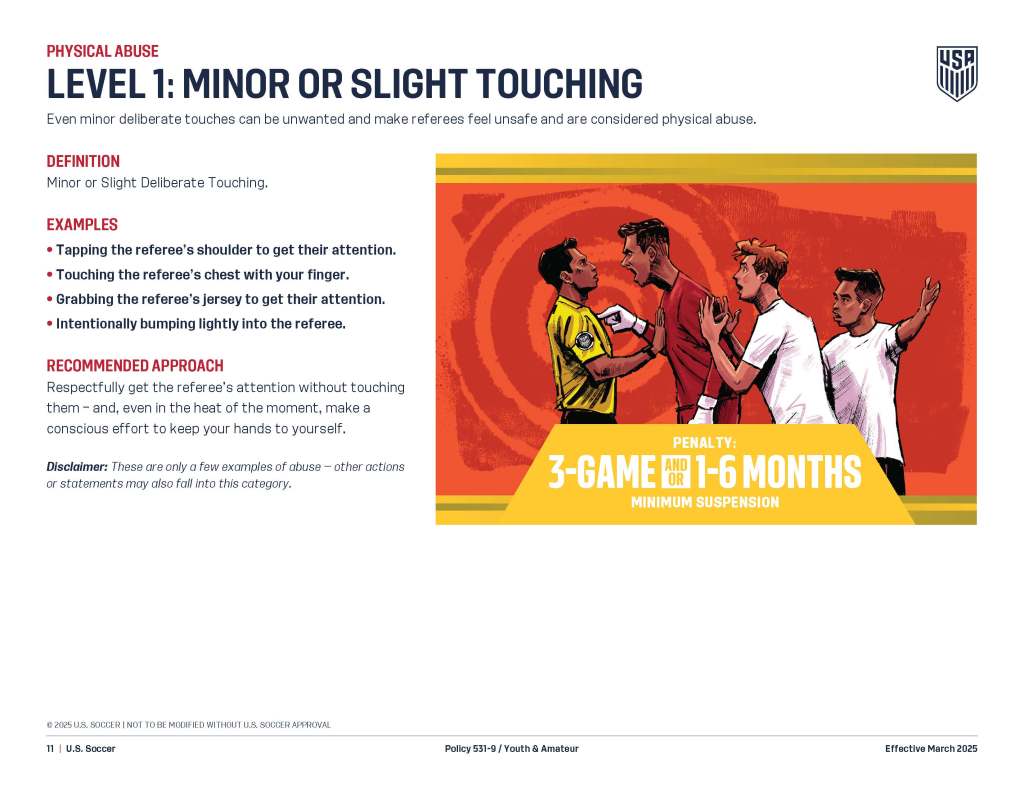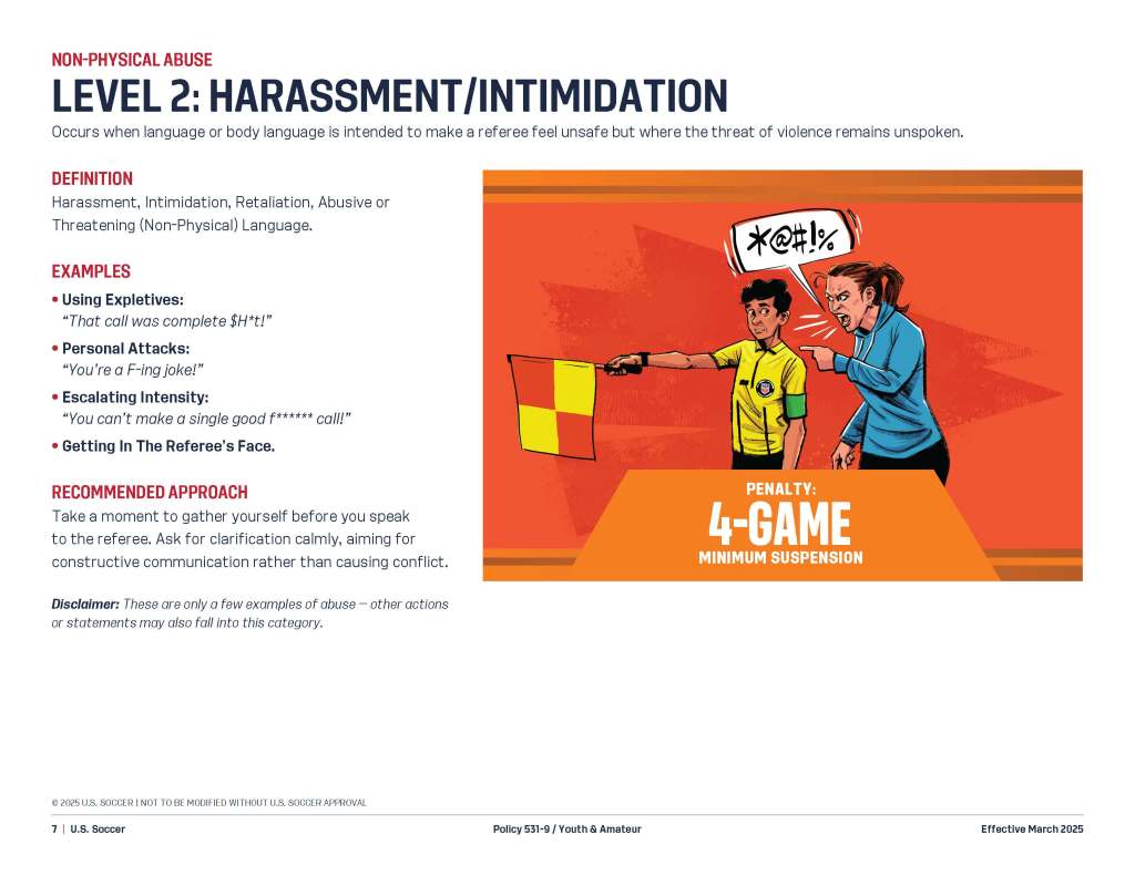U.S. Soccer’s updated Referee Abuse Prevention Policy (Policy 531-9) is in effect. This policy update includes clearer definitions for physical and non-physical abuse – as well as stronger suspensions for reported referee abuse.